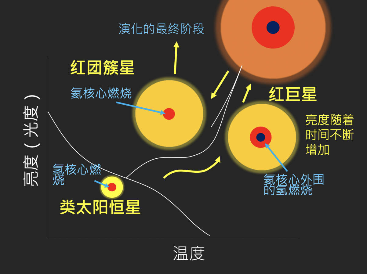 图2. 小质量类太阳恒星演化示意图。黄色箭头标记了恒星演化的轨迹。红巨星的初期与红团簇星大小相似,颜色相同。