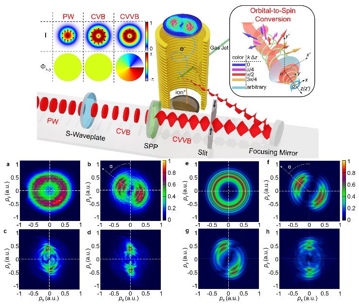 上:光场的轨道-自旋相互作用及光电子成像实验示意;下:实验结果及理论模拟