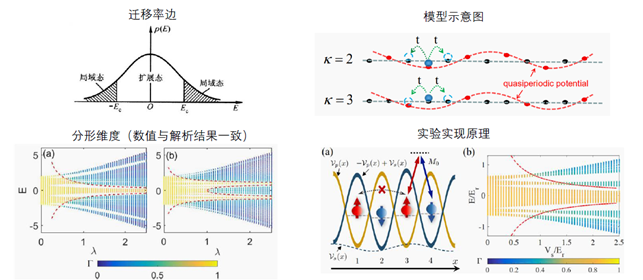 本文提出一类基本的精确可解准周期嵌套模型。这类模型包含两项基本要素(见示意图):1. 近邻格点间的常规跃迁项;2. 等间距地嵌入到主晶格上的准周期势,即准周期势并非施加在每个格点上,而是每K个格点只有一个格点被施加准周期势。实际系统要每间隔一些格点施加周期势并不容易,但这类模型有巧妙的物理方案。比如在K=2时,可以将两相邻格点分别用自旋朝上和自旋朝下两种不同内秉态实现,于是常规近邻格点间的跃迁项等价通过自旋翻转跃迁实现,而通过只对其中一种自旋态(如自旋朝上)施加准周期势,即可实现所需的等间距嵌入准周期势。这种方案可以完好地基于拉曼光晶格(主要思想由刘雄军等在过去一系列工作提出,并广泛用于人工自旋轨道耦合和拓扑物相的研究)实现。进一步的理论和数值计算表明在实验参数下可以获得理想的有精确迁移率边的模型条件。数学上,作者们通过将2015年菲尔兹奖的全局理论应用到该模型,不仅优美地给出了这类模型的迁移率边的精确表达式,而且严格给出了所有态的局域或扩展的定量性质。这项工作体现了物理和数学完美结合,并为精确迁移率边的实现和探测指明了方向。也为迁移率边和局域化的相关物理的精确研究提供了新的思路。该工作提出的模型简洁优美,且有高度实验可行性,因此该模型有望成为研究迁移率边以及相关物理的一类基本模型。