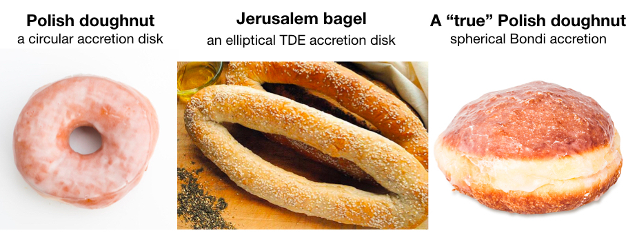 标准圆吸积盘通常被称为“波兰甜甜圈”(一个由英国著名科学家Martin Rees爵士创造的名字。Martin Rees爵士同时也是TDE经典理论之父之一)。为了突出椭圆吸积盘与标准圆吸积盘在几何形状上的不同,同时保留以糕点命名的传统,以色列著名科学家Tsvi Piran教授为椭圆吸积盘创造了“耶路撒冷百吉饼(Jerusalem bagel)”(见下图)这一名字。为了强调与以色列Piran教授等人的椭圆吸积盘模型在几何上的相似性和物理上的不同性,在被接收发表的论文中所描述的椭圆吸积盘被称为“来自北京的耶路撒冷百吉饼(Jerusalem bagels from Beijing)”。值得注意的是,真实的波兰甜甜圈的形状更类似于具有球状几何的邦迪吸积(Bondi accretion)。