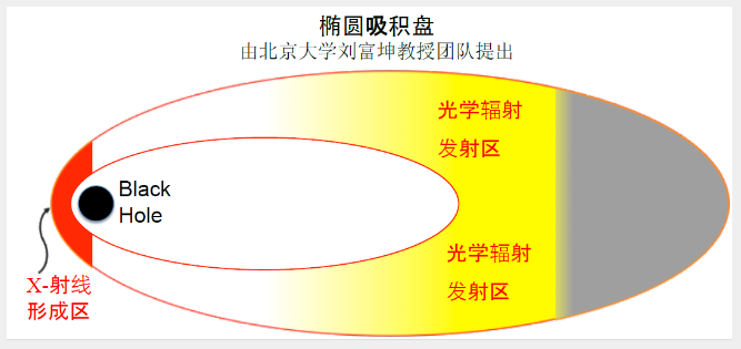 欧冠官方网站天文系和科维理天文和天体物理研究所刘富坤教授领导的研究团队提出了一个物理上完全不同的新型椭圆盘模型(见示意图)。在该吸积盘模型中,软X-射线光子在椭圆盘绕黑洞的近心点处产生,形成后被电子散射囚禁在吸积盘物质内,随物质一起绕黑洞旋转(类似光纤)。这些软X-射线光子在随物质一起绕黑洞作椭圆绕转的过程中光致电离吸积盘物质。被电离的物质在复合时,发射出低频连续谱和光学发射线。在最近被国际著名天体物理杂志ApJ接收发表的论文中,刘富坤教授带领团队研究了该理论模型的动力学和热辐射性质,并非常漂亮地解释了那些严峻挑战传统圆化吸积盘模型的TDE光学/紫外辐射谱和总辐射光度的观测。欧冠官方网站的博士生曹春洋、曹荣、周智勤,波兰尼古拉斯·哥白尼天文研究中心的Marek Abramowicz教授以及哈佛大学的Maciek Wielgus博士是论文的共同作者。