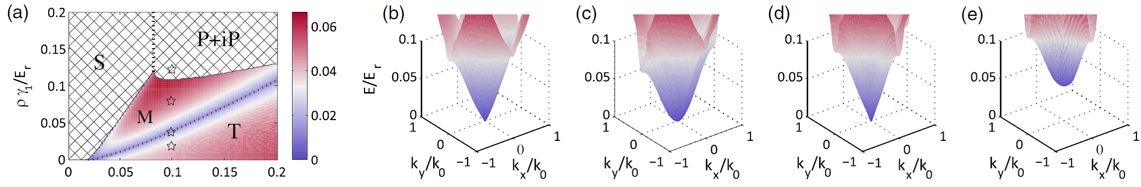 (a) s-p轨道超流的相图;(b-e)Nambu-Goldstone玻色子能谱,其中的第二类非常规Nambu-Goldstone玻色子在(a)图中M和T的相边界得到。