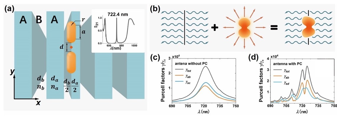 拓扑光子晶体的拓扑态具有光子无散射传播和免疫缺陷的拓扑保护特点,被越来越多地运用在微纳光子学和量子光学器件上,成为重要的光学新兴领域。微纳尺度的单光子源是片上量子信息处理的重要部分,利用微纳光子器件结构的局域场增强来改善单光子自发辐射是实现单光子源的关键原理,但无法避免散射和吸收造成的损耗,且在传输中单光子收集效率不高。研究团队首先提出了由拓扑态主导的模式耦合的原理,通过精心设计光学模式,将金属纳腔置于一维拓扑光子晶体中(图1(a)),通过拓扑态主导模式耦合的机制(图1(b)),实现了超大的珀塞尔增强,并得到了珀塞尔增强的吸收减少效应(图1(c, d))。同时,通过利用拓扑边界态作为光子传输通道,使得非吸收损耗的光子几乎全部被收集的高光子收集效率(图1(d)),最大光子收集率达到了79.5%。这种拓扑态主导模式耦合机制和相应的吸收减少效应,可以拓展到更高维度的光子结构上,对以后的拓扑光子晶体和微纳尺度腔量子电动力学的研究产生重要影响。同时,无散射的大珀塞尔增强可以应用在片上量子光源的制备上。