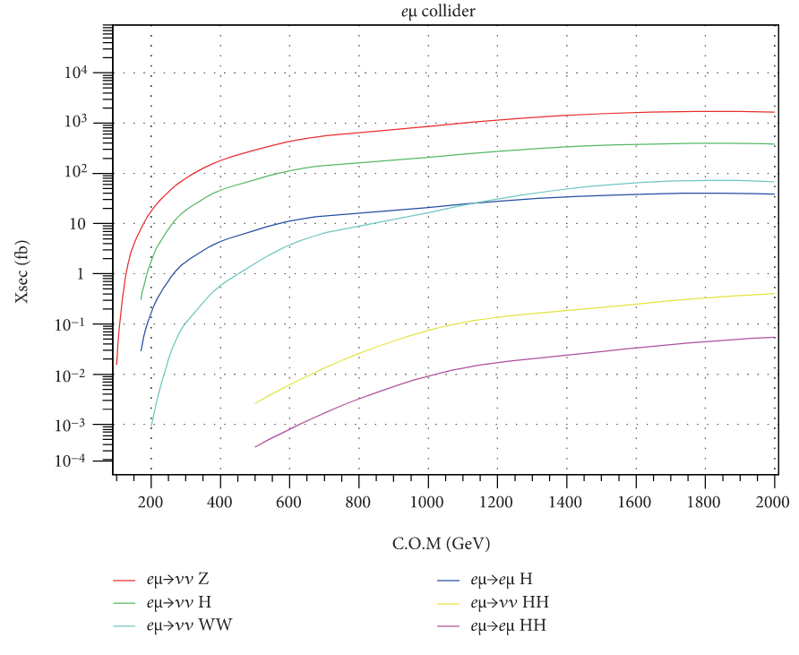图1:不同对撞能量的电子—缪子对撞机上各种物理过程的截面。这些物理过程基本都是矢量玻色子熔合或散射过程。