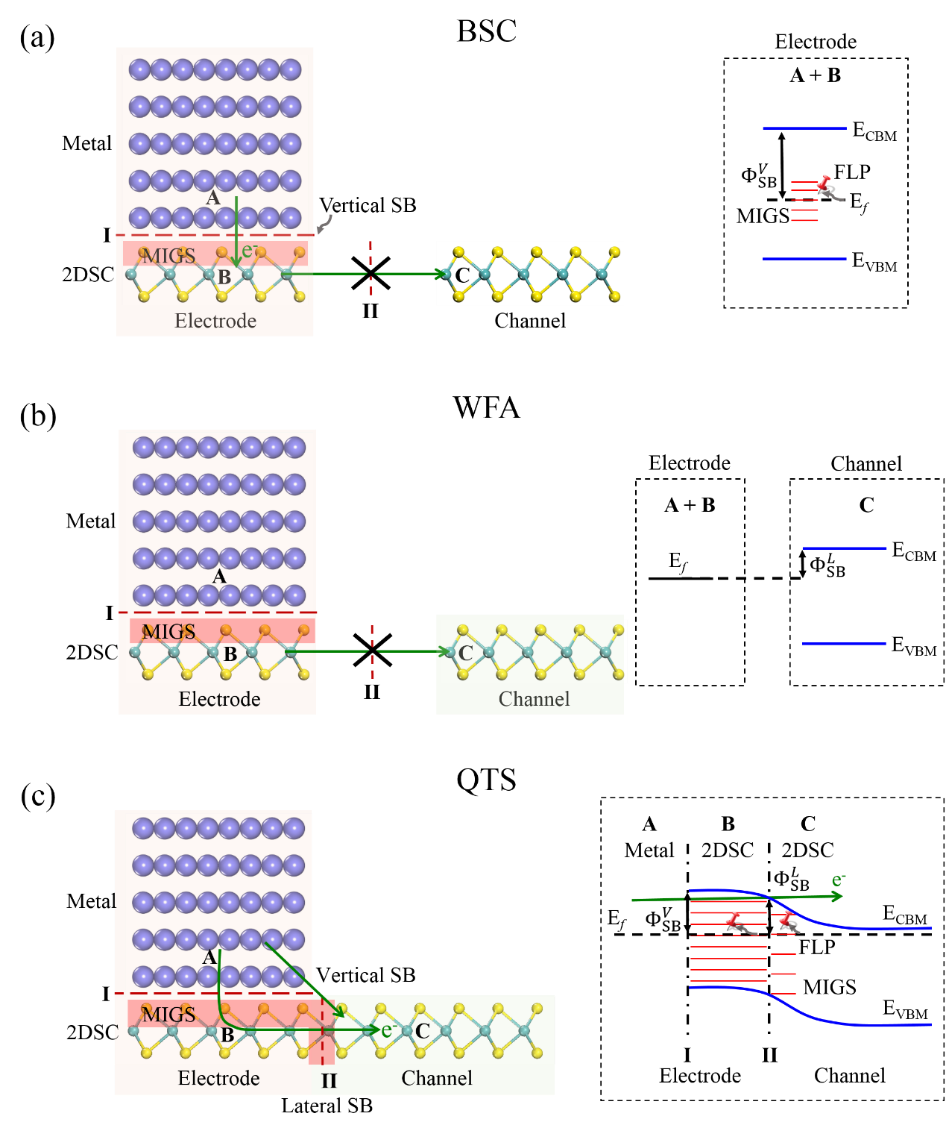 图1 能带计算(BSC)、功函数近似(WFA)和量子输运模拟(QTS)的原理示意图
