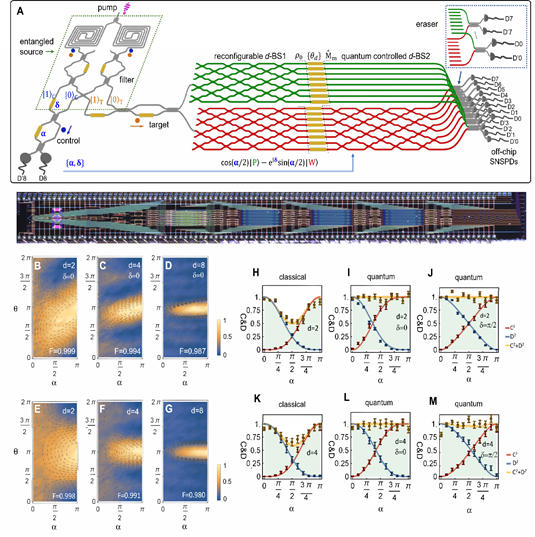 图 A.大规模集成的可编程硅基光量子芯片线路示意图和芯片实物图;B-G.片上延迟实验条件下观测到的多路径波动性和粒子性转化分布,可看出实验结果和理论分析高度一致(F值);H-M.多路径量子体系中普适化玻尔不等式的实验验证