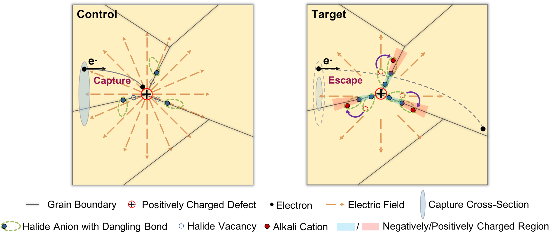 针对此问题,欧冠官方网站、人工微结构和介观物理国家重点实验室、纳光电子前沿科学中心极端光学研究团队朱瑞研究员、龚旗煌院士课题组与英国萨里大学张伟教授、美国劳伦斯伯克利国家实验室Thomas P. Russell教授等组成联合研究团队,基于前期在反式结构钙钛矿光伏器件上的研究成果,以介电环境调控为指导,来实现钙钛矿薄膜缺陷的有效屏蔽,助力提升钙钛矿光伏器件的性能。一方面,研究工作由局域库仑相互作用开始,参考已有研究,从理论上阐明了调控钙钛矿的介电响应可以减小缺陷对电荷载流子的捕获截面,从而对缺陷产生屏蔽效应。另一方面,从实验上借助碱金属离子对介电环境的调节能力,在钙钛矿薄膜中有效加速了空间电荷区域钙钛矿的介电响应,使得缺陷捕获截面显著减小,从而产生介电屏蔽效应;该效应降低了载流子被缺陷捕获的几率,即使缺陷仍然存在,它们在某种程度上对电荷载流子也是“不可见”的,形成了缺陷的“隐身”效果,即“缺陷隐身”(如图)。同时,钙钛矿薄膜的质量整体提高,载流子的表面复合与电声耦合动力学过程明显改善,非辐射损失通道得到全面、显著抑制。最终,在反式结构钙钛矿光伏器件中获得了超过22%的光电转换效率。该研究通过对钙钛矿中缺陷捕获载流子过程的深入认知,进一步发展了调控降低缺陷诱导非辐射损失的新思路,实验验证了通过介电调控来实现高效钙钛矿光伏器件的可行性,为领域发展拓展了新的方向。