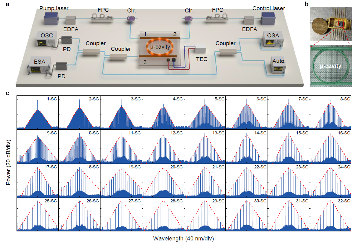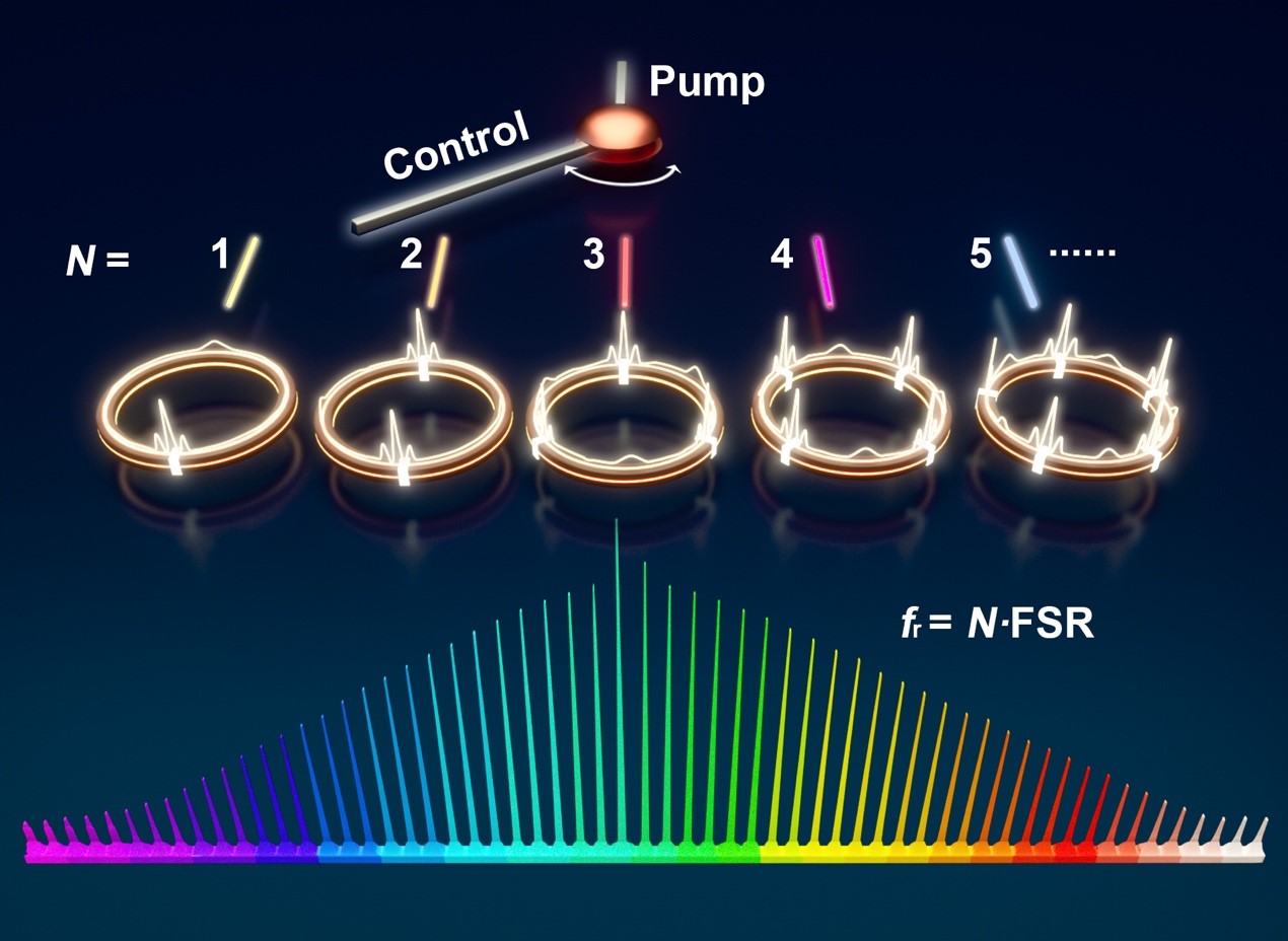 日前,欧冠官方网站、纳光电子前沿科学中心、人工微结构和介观物理国家重点实验室肖云峰教授、龚旗煌院士课题组与中国科学院西安光学精密机械研究所瞬态光学与光子技术国家重点实验室张文富研究员课题组合作,在集成微腔光频梳领域取得进展:利用合成势阱场首次在同一微环谐振腔上实现了具有32种重复频率的孤子晶体光频梳,其重复频率覆盖了多个射频波段和太赫兹波段。