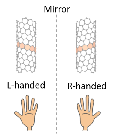螺旋性是碳纳米管最基本的量子结构属性之一。相同手性指数的碳纳米管具有互为镜像的左旋和右旋两种螺旋结构(如图1所示),并具有迥异的物理化学性质(如光圆二色性、磁圆二色性等)。作为碳管结构光谱表征最后一项亟待攻克的技术难点,单根碳管螺旋结构的高效测定不仅对于碳基电子学领域具有重要意义,同时也有望推动碳纳米管在结构化学、生物学、偏振光学以及自旋电子学等领域的应用研究。