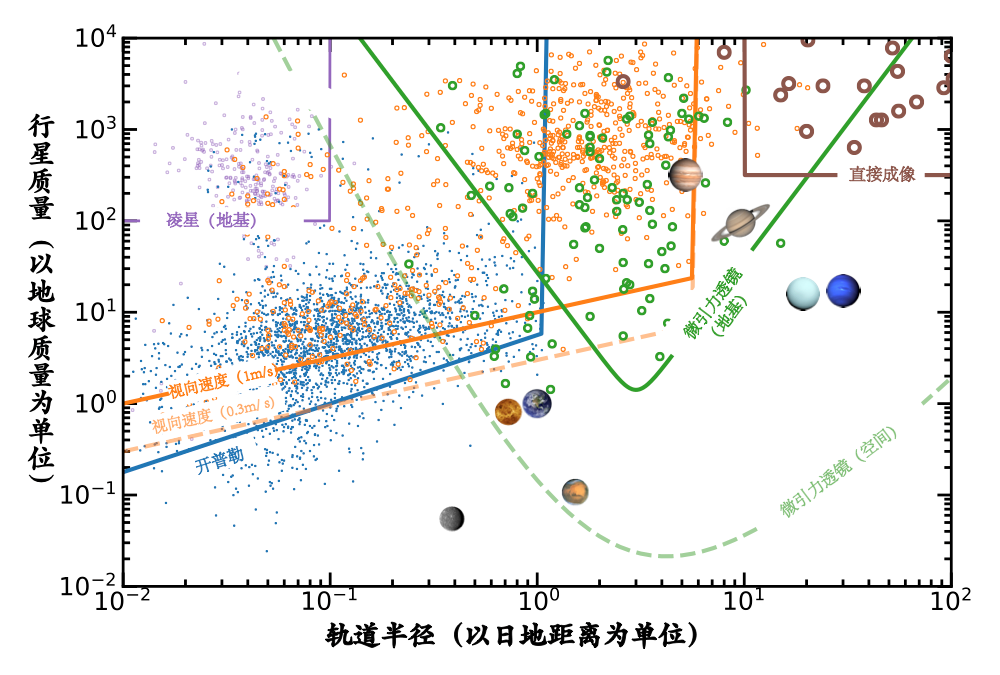已知系外行星的质量-轨道半径分布(不同颜色的点代表不同方法发现的行星,其中紫色点表示地基望远镜凌星法,蓝色点表示开普勒卫星凌星法,橙色点表示视向速度法,绿色点表示地基望远镜微引力透镜法,褐色点表示直接成像法;实线表示不同方法探测的灵敏区间,绿色虚线表示未来空间望远镜微引力透镜法的预计探测区间;内插图标识了太阳系八大行星)