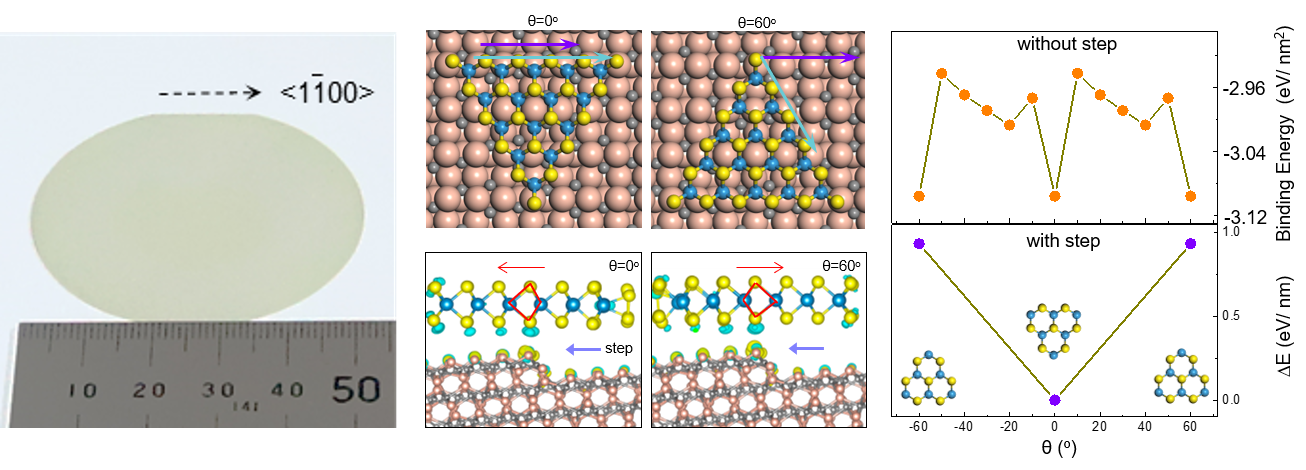 近期,刘开辉与韩国基础科学研究院丁峰教授、复旦大学吴施伟教授、北京理工大学赵芸副教授、华南师范大学徐小志研究员等合作,提出二维材料与绝缘衬底面内范德华耦合作用和台阶相互作用的双耦合协同调控新机理(见下图),实现了2 in(英寸)单层单晶WS2的外延制备。这一生长机理的关键物理思想在于:一方面,WS2和蓝宝石衬底间的范德华相互作用将WS2晶畴的优势取向限制为0°与180°;另一方面,WS2和蓝宝石台阶间的相互作用可以打破两个取向的能量简并性,从而使WS2晶畴只保留一个优势取向。联合研究团队发现该机理也适用于其他二维单晶材料的制备,并在a面蓝宝石衬底上同时实现了单晶MoS2(二硫化钼)、WSe2(二硒化钨)和MoSe2(二硒化钼)的外延生长。系列研究成果将有望推动二维过渡金属硫族化物在电子、光电子以及谷电子学器件等方向的应用。