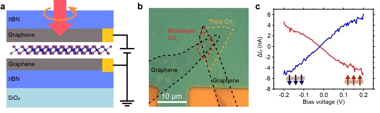 a.旋光性探测器结构示意图;b. 单层CrI3旋光性探测器光学照片;c. 不同磁化状态的单层CrI3在左旋、右旋圆偏振光照下的光电流之差,其中红色和蓝色分别表示向上和向下磁化的CrI3