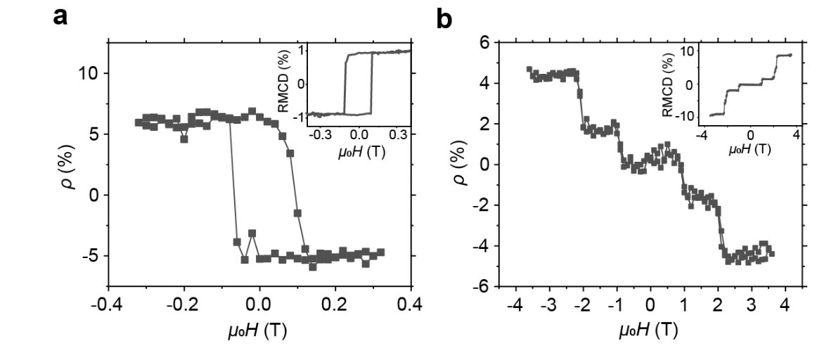 a.单层CrI3旋光性探测器的光响应偏振度随磁场的变化(内插图为单层CrI3的RMCD谱,表明其具有铁磁性);b.多层CrI3旋光性探测器的光响应偏振度随磁场的变化(内插图为多层CrI3的RMCD谱,表明其具有反铁磁性)