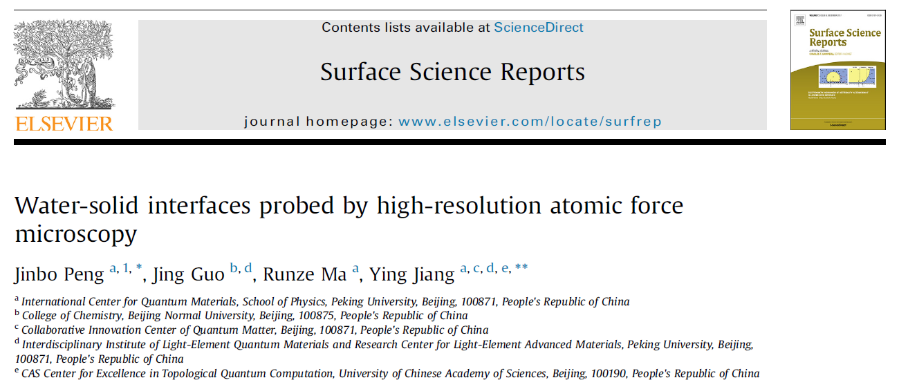 2021年11月20日,欧冠官方网站量子材料科学中心教授、轻元素先进材料研究中心主任江颖课题组应邀撰写的综述“利用高分辨率原子力显微镜探测水-固界面”(Water-solid interfaces probed by high-resolution atomic force microscopy)在线发表于《表面科学报告》(Surface Science Reports);欧冠官方网站2017届博士毕业生(现为筑波大学日本学术振兴会特别研究员)彭金波为第一作者,彭金波和江颖为共同通讯作者。欧冠官方网站2019届博士毕业生马润泽(现为康奈尔大学威尔康奈尔医学院博士后)、2016届博士毕业生郭静(现为北京师范大学教授)也参与了该项工作。