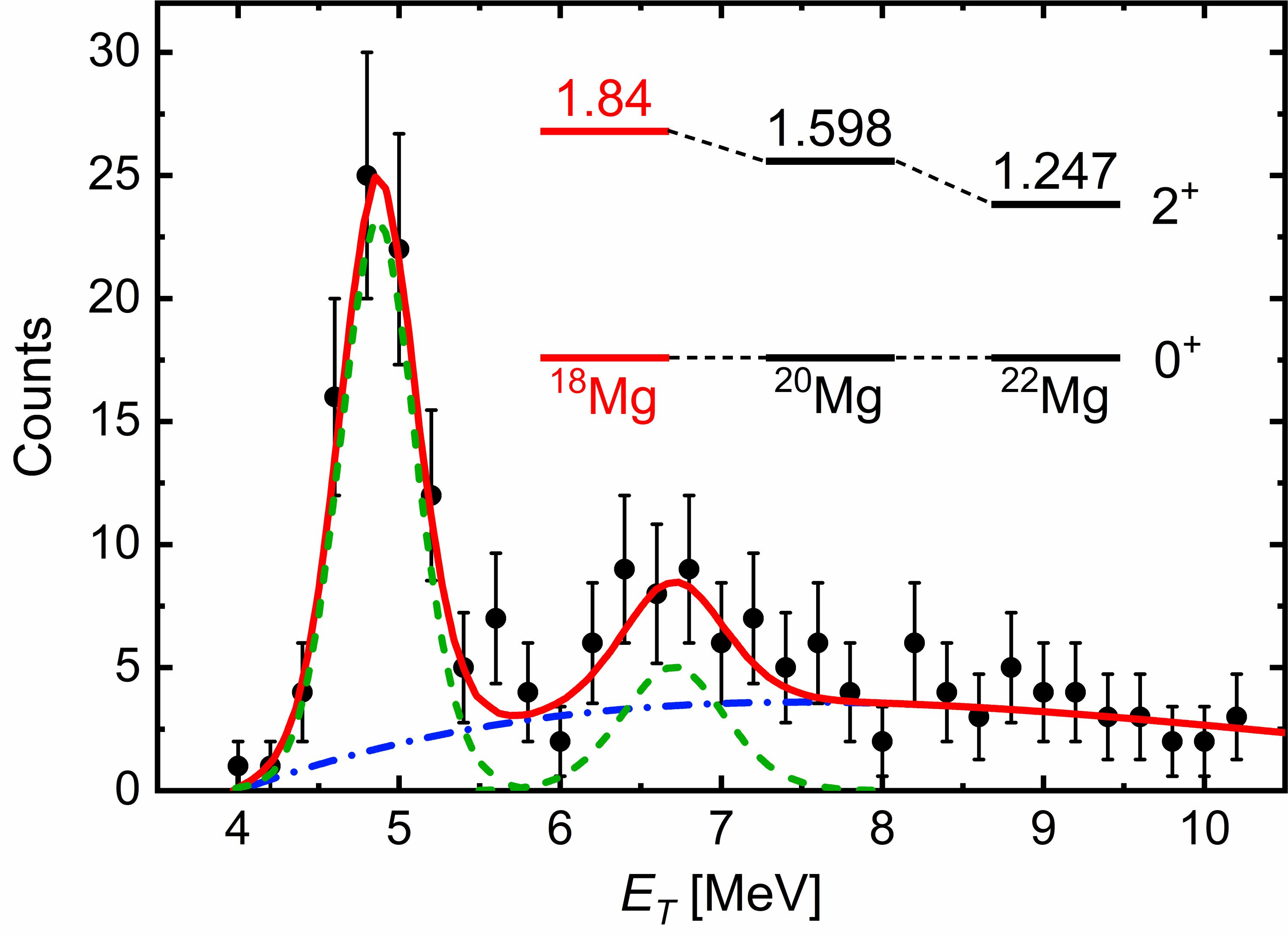 联合研究团队通过研究衰变末态的四个质子和剩余核14O的能量关联,发现18Mg基态经过级联的两步双质子同时发射的过程进行衰变。作为中间态的16Ne(氖)基态寿命相对较长,因此前后两步双质子发射过程彼此相对独立。实验结果同时揭示出18Mg基态与16Ne基态的衰变关联的相似性,表明18Mg基态的双质子衰变过程很可能也以s波的质子发射为主。实验的另一个重要发现是,同时观测到18Mg中可能的第一个2+态,其激发能比邻近的偶偶核同位素20Mg(拥有8个中子的满壳层)更高,为Mg同位素中N = 8中子壳能隙的减弱提供了新的证据。