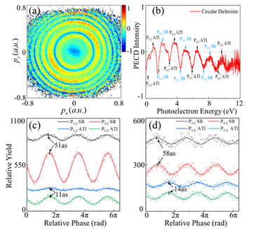 图2 动量分辨(a)、能量分辨(b)的圆二向色性谱,以及双色同向旋(c)、反向旋(d)圆偏时测量到2P3/2和2P1/2的自旋-轨道引起的光电离延时