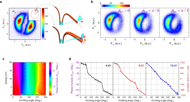 (a)传统阿秒钟中稳态隧穿和非稳态隧穿示意图;(b)新型双指针阿秒钟在不同相位下的光电子动量谱;(c)实验提取的“相位之相位”谱;(d)不同电子能量处的时间-角度映射曲线