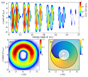 图2 (a)反向自旋-反向涡旋的双色时空涡旋光束驱动产生的HHG谱;(b)极紫外STOV的时空强度分布;(c)极紫外STOV的时空相位分布