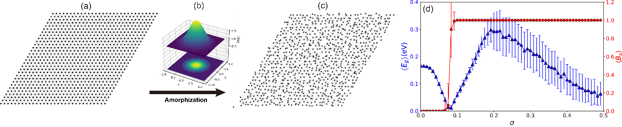 结构非晶化诱导的拓扑相变:(a~c)通过在平衡位置附近的扰动导致的结构无序;(d)随着结构无序程度的增加,能隙闭合后再被打开并且拓扑不变量出现跃变