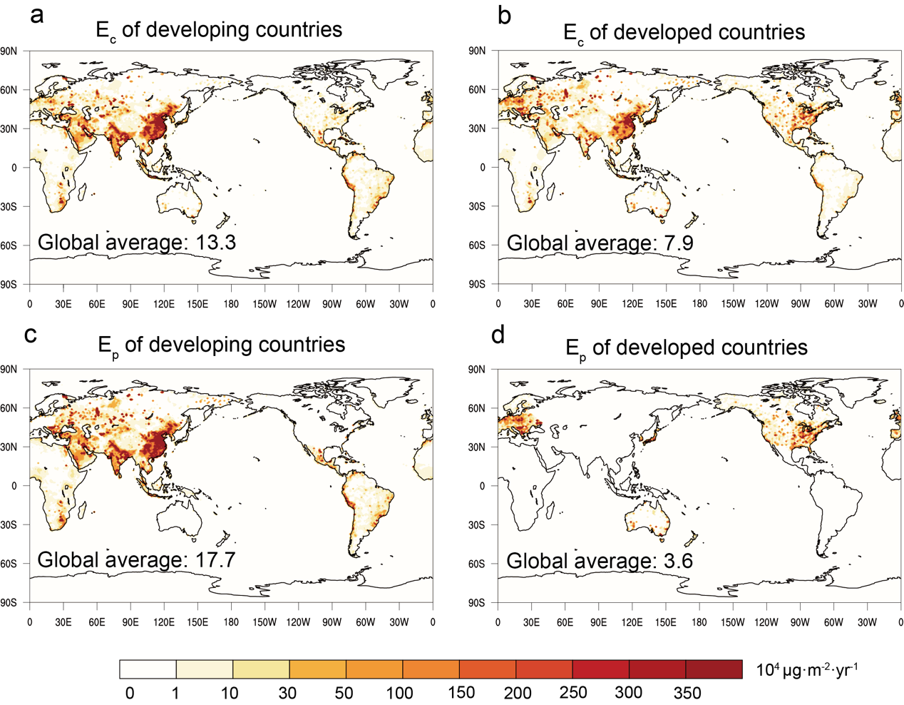 气溶胶的气候效应与其浓度及空间分布之间存在极强的非线性复杂关系。研究人员发现,发展中国家消费活动所引起的硫排放和硫酸盐浓度在亚洲中低纬地区存在明显的极大值,这也导致了有效辐射强迫最大值集中在北半球中低纬度地区;相比之下,发达国家消费相关的硫酸盐在北半球的纬向分布较为均匀,并且整体所处的纬度更高。由于高纬地区大气环流、海冰等系统对辐射变化更加敏感,因此,发达国家虽然硫排放总量小于发展中国家,但其单位硫排放引起的有效辐射强迫和气候效应更强。