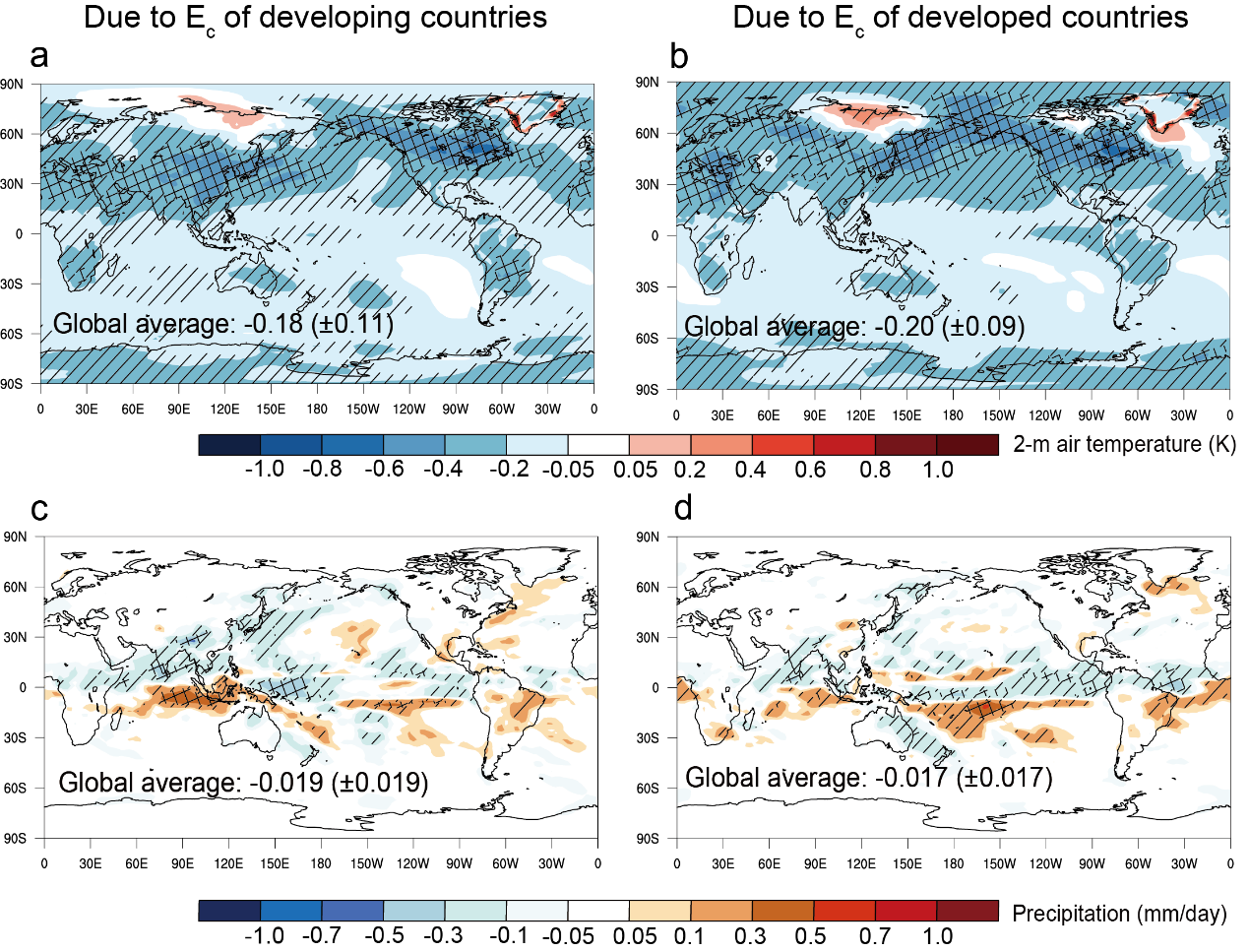 图2 发展中国家(左)和发达国家(右)消费相关的硫酸盐气溶胶引起的全球温度响应(上)和降水响应(下)。