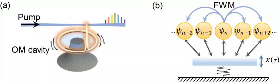 图1 (a) 光力微腔中的孤子脉冲示意图;(b) 光学和机械模式相互作用示意图