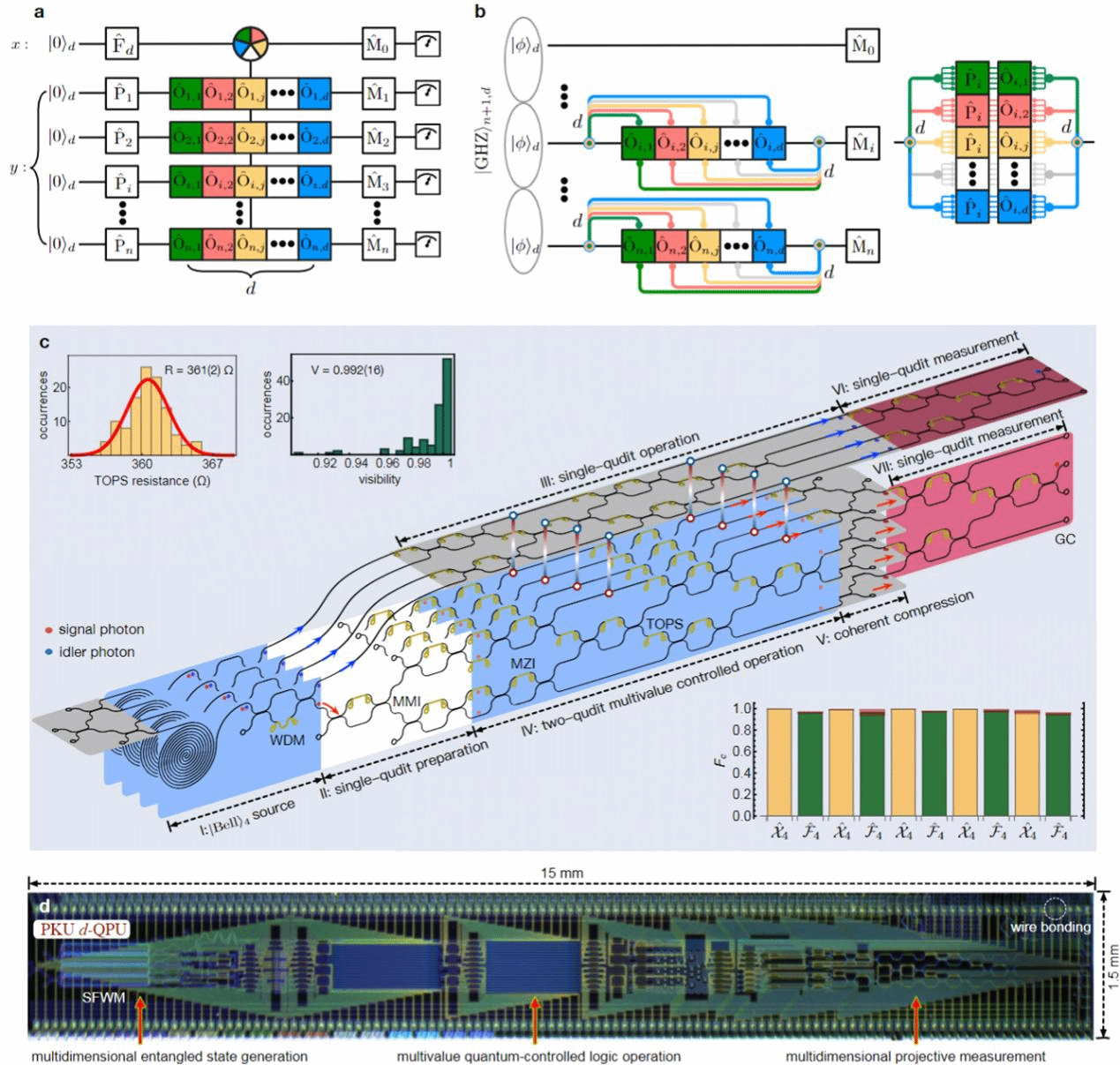 基于互补金属氧化物半导体制造工艺的硅基集成光量子芯片技术为高维量子计算和量子信息处理提供了可能。硅基光量子芯片具有可制备复杂量子纠缠态、量子操控保真度高、可编程重构和可大规模集成量子器件等优势。欧冠官方网站现代光学研究所、人工微结构和介观物理国家重点实验室、纳光电子前沿科学中心、“极端光学创新研究团队”王剑威研究员和龚旗煌院士研究团队,在前期工作中发展了一种硅基光量子芯片上多路径编码的高维量子信息技术,例如实现了高维体系量子相干性和广义波粒二象性的实验测量(Nature Communications 12, 2712 (2021))、十五维度量子纠缠态的精确制备和可编程操控及其量子非局域等基本物理特性的测量(Science 360, 285 (2018)),进而利用高维量子比特等价量子比特的方法演示了八比特簇态光量子计算功能(Nature Physics 17, 1137 (2021))。然而,为了实现高维量子位直接编码的高维量子计算功能,还需要实现高维单量子位逻辑门、高维双量子位纠缠逻辑门、及其高维组合逻辑门,并要求其具有高编程可操控性、高保真度和可测量读取的能力,这些关键技术的缺失一直限制了高维量子计算的发展。