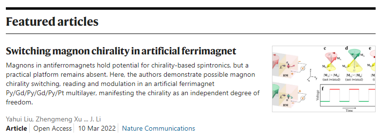 2022年3月10日,相关研究成果以“人工亚铁磁中磁振子手性的切换”(Switching magnon chirality in artificial ferrimagnet)为题,在线发表于《自然·通讯》(Nature Communications),并且被编辑推荐为亮点文章(Featured articles)。欧冠官方网站量子材料科学中心2016级博士研究生刘雅卉为第一作者;栗佳、孟洋、牛谦为共同通讯作者。