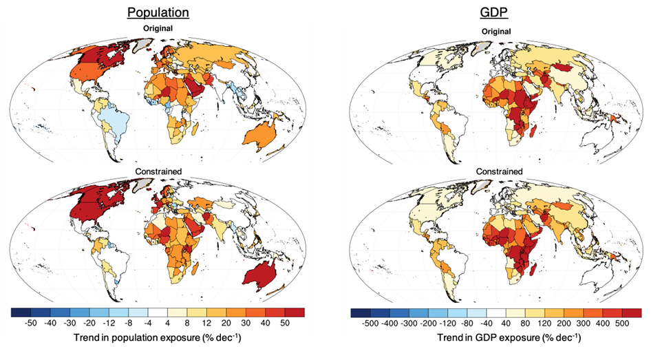图2基于CMIP6模式未经约束(上排)和约束后(下排)的2011—2100年野火对人口(左)和国内生产总值(GDP)(右)造成的压力趋势预测