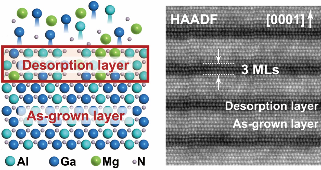 深紫外LED器件因对新型冠状病毒具有显著的灭杀效果而成为面向人民生命健康的国家重大需求,高铝组分铝镓氮(AlGaN)的高效p型掺杂是实现高性能深紫外LED器件的关键。然而,AlGaN中镁(Mg)杂质离化能很大,成为实现其高效p型掺杂的核心难题。短周期超晶格技术路线能有效降低AlGaN中Mg杂质的离化能,并通过微带有效提升载流子输运性能;但是,短周期超晶格中微带的形成要求可控制备亚纳米厚度势垒层,这对氮化物半导体的主流制备方法MOCVD外延技术是一个巨大挑战。