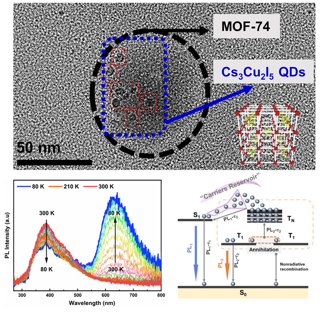 鉴于此,基于前期对无铅钙钛矿量子点的研究基础,欧冠官方网站现代光学研究所、人工微结构和介观物理国家重点实验室曲波课题组首次采用MOF限域法,在室温条件下原位制备出高湿度稳定性的无铅类钙钛矿Cs3Cu2I5深蓝光量子点,平均粒径仅为4.3 nm。从TEM 图像(图1)中可以明显看到Cs3Cu2I5 量子点被“镶嵌”在MOF框架内。Cs3Cu2I5量子点荧光发射峰位于390 nm,相应色度坐标为(0.17, 0.07),接近国际上定义的标准蓝光色度坐标(0.14, 0.08)。凭借MOF材料有效的支撑保护作用,量子点的湿度稳定性非常优异,在相对湿度70%的环境中储存1440 小时后,Cs3Cu2I5量子点仍能保持初始发光效率的87%。变温光致发光测试(图1)表明,Cs3Cu2I5量子点具有明显的温度依赖性,即随着温度降低,原有深蓝色荧光发射逐渐减弱,同时出现一个峰位650 nm 的橙色发射峰,该物理过程类似于有机发光中的三线态-三线态-湮灭上转换过程。课题组根据Cs3Cu2I5量子点荧光发射与寿命衰减特征,构建出了Cs3Cu2I5@MOF中的载流子输运模型(图1),并合理解释其物理机制。