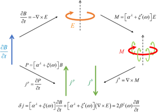 图中包括 (1) 极化电流jp = ∂t P,P为磁电耦合诱导的电极化强度; (2)法拉第定律∂t B = -∇ × E; (3)磁电耦合诱导的磁化强度M; (4) 束缚电流jb = ∇ × M。考虑新型反对称磁电耦合后,时变磁场会诱导出动态磁电流δj = 2βξ(ω)∂t B,βξ(ω) = [ ξ(ω) - ξ’(ω)] / 2。