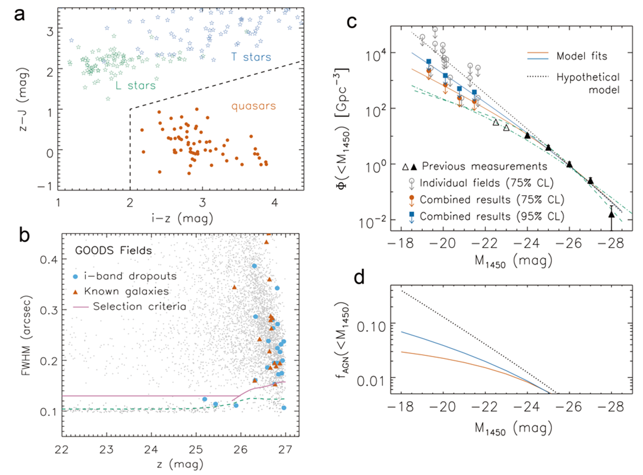 (a)利用多波段测光数据选择类星体候选体;(b)利用哈勃高空间分辨率图像证认类星体;(c)覆盖近10个星等范围的高红移类星体光度函数;(d)类星体对宇宙再电离的贡献小于7%(95%置信度)。