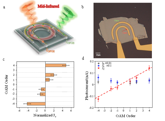 图a:携带OAM的中红外光束产生的OPGE光电流测量示意图;图b:具有U形电极的TaIrTe4器件光学显微照片;图c-d:TaIrTe4器件在涡旋光激发下生成的OPGE光电流及其对OAM顺序的依赖性的证据。图c显示了归一化光电流随OAM的变化。右图显示了被测光电流的三个不同周期成分对激发光OAM阶数的依赖。