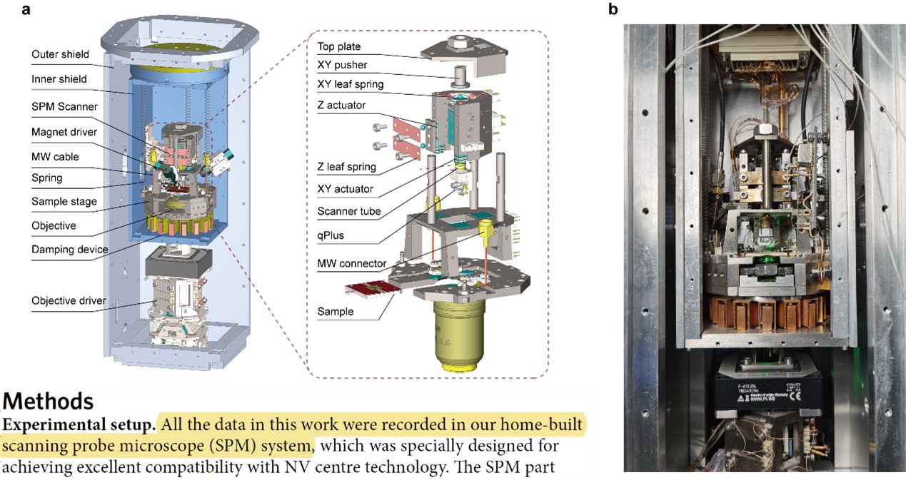 图1 a:自行研制的扫描量子传感显微系统模型图,这项工作的全部数据均来源于该系统;b:扫描量子传感显微系统核心探头的实物照片