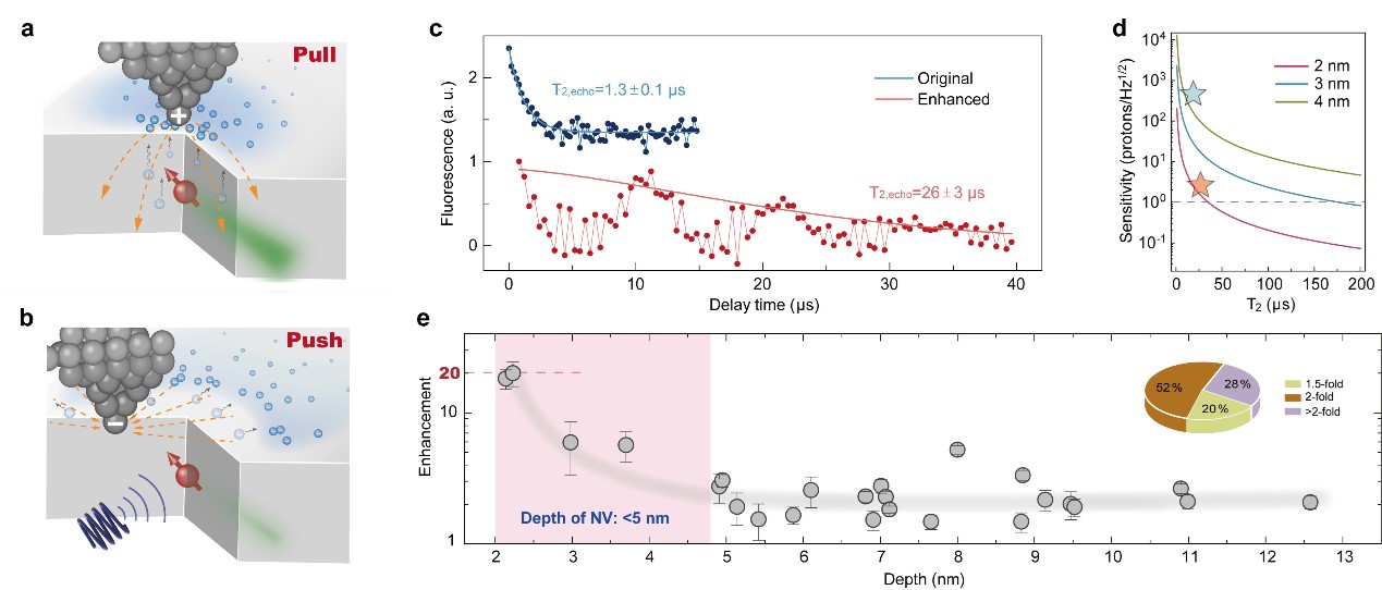 图2 a和b:利用SPM针尖局域强电场操纵金刚石近表面电子自旋库的示意图(Pull-and-Push Method);c:基于针尖操纵法实现了浅层NV色心相干性的大幅提升(T2时间提升20倍);d:相干性提升后的浅层NV色心探测灵敏度逼近单个质子;e:针尖操纵法对NV色心T2时间的提升倍数统计。该方法对于深度5 nm以内的色心尤为有效