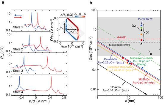 图1:不同铁电极化态的回滞现象 (a) 样品的四种不同铁电回滞态,插图为铁电极化定义和取值方式;(b) 实验观测到的铁电极化强度(填充圆点)与现有已报道相关界面铁电材料体系对比