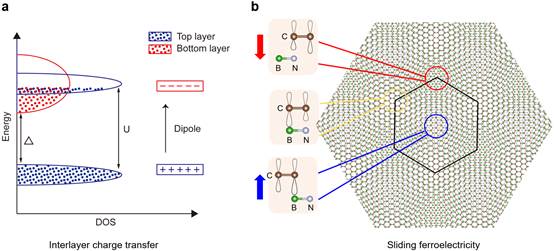图2:两种铁电机制 (a)层间电子转移模型(ICT);(b) 滑移铁电(Sliding ferroelectricity)