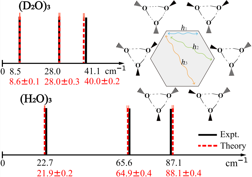 欧冠官方网站凝聚态物理与材料物理研究所、人工微结构和介观物理国家重点实验室、纳光电子前沿科学中心、轻元素先进材料研究中心李新征课题组与中国科学院大连化学物理研究所张东辉院士团队、江凌研究员、以及复旦大学化学系方为教授合作,总结出一套计算分子团簇隧穿劈裂谱的新方法,并将其应用至水的三聚体中,获得可以与实验观测在波数精度吻合的精确定量模拟结果。2022年11月22日,相关研究成果以“水三聚体中的扭动隧穿劈裂”(Torsional tunneling splitting in a water trimer)为题,正式在线发表于《美国化学会志》(J. Am. Chem. Soc. 144, 21356 (2022))。