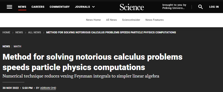 2022年11月30日,《科学》(Science)以“新方法解决微积分未解难题,促进高精度粒子物理计算”(Method for solving notorious calculus problems speeds particle physics computations)为题,长篇报道了欧冠官方网站马滟青研究员课题组在微扰量子场论研究中取得的突破性进展。