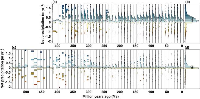 图2:各地质时期煤和蒸发岩地质记录所对应的年平均净降水量(降水减去蒸发)。(a) 4.1亿年前至今煤形成对应的净降水量,(b) 4.1亿年前至今煤形成对应的净降水总分布。(c) 5.4亿年前至今,蒸发岩地质记录对应的将降水量,(d) 5.4亿年前至今,蒸发岩形成对应的净降水总分布。