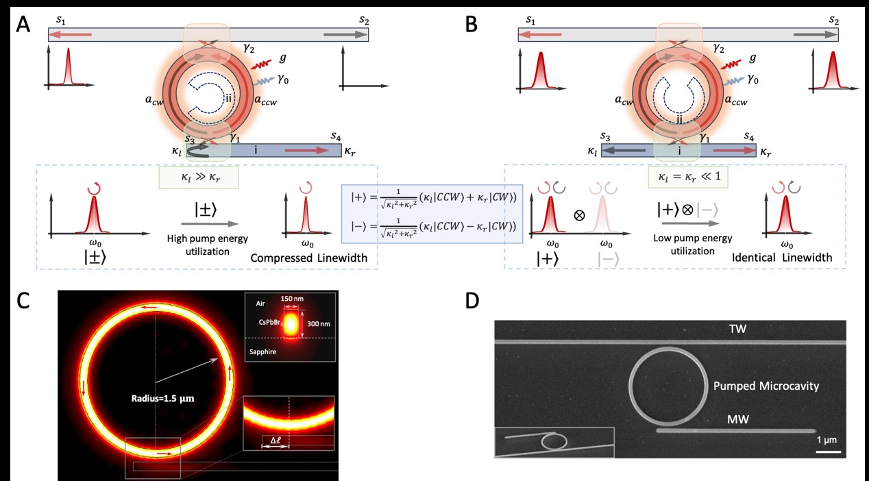 图1.所提出的基于ES调制的微纳激光系统的方案。(A)所提出的系统示意图,其中MW相对于微腔(构型i和ii)不对称放置,以实现逆时针(CCW)行波模式的单向传播。(B)对照系统示意图,其中MW相对于微腔(构型i和ii)对称放置,在微腔中同时存在CCW和顺时针(CW)分量。(C)通过本征频率模拟获得的ES调制的系统的本征模电场分布(微腔半径为1.5 μm)。(D)所制备的CsPbBr3微腔-MW-TW耦合系统的SEM图像。