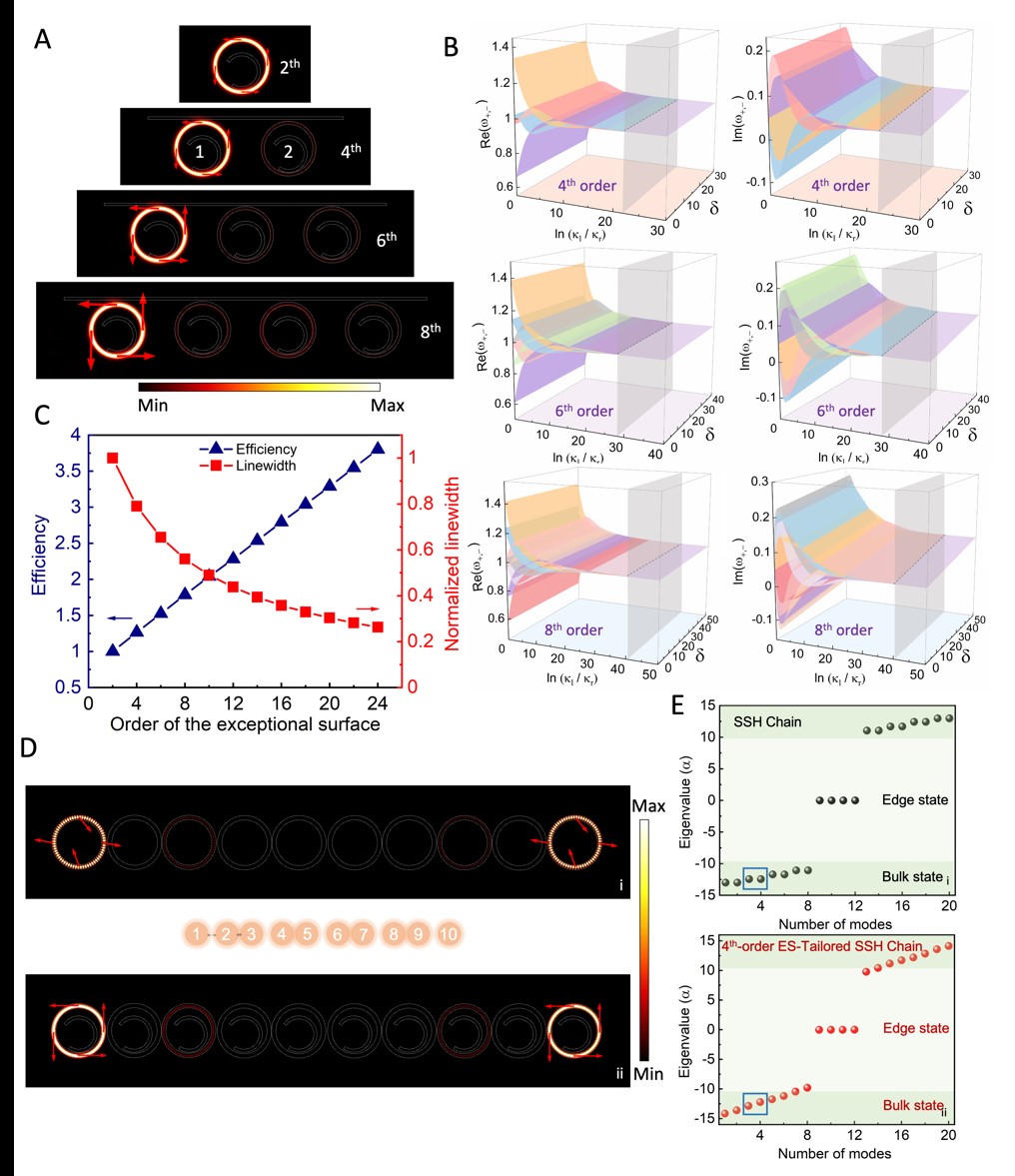 图3.所提出的ES调制的微纳激光器方案的扩展性研究。(A)高阶ES电场分布的仿真模拟结果。(B)不同阶ES系统本征值实部和虚部随着MW的反射系数比和系统相关参数δ的变化。(C)TW左端口的激光效率(蓝色)和线宽(红色)与ES阶数的关系,通过构建更高阶的ES可以实现更窄的线宽和更高的能量转换效率。(D)i.没有非厄米ES调制的微腔SSH链(链两侧的四个边缘模式表现为驻波)的场分布的模拟结果,ii.具有非厄米ES调制的微腔SSH链(四个边缘模式最终演变成简并CCW行波模式)的场分布的模拟结果。(E)能量本征值分布随着系统中本征模的数量的变化。i.没有非厄米ES调制的微腔SSH链,ii.四阶ES调制的微腔SSH链。