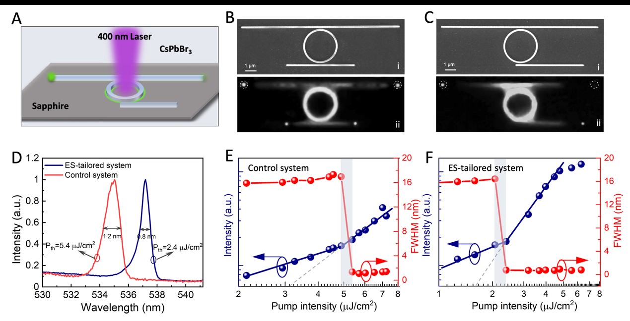 在实验中,CsPbBr3单晶钙钛矿薄膜被用作增益/损耗材料(无外部泵浦的情况下表现为损耗态),它具有高光学增益系数、低成本且易于制备。实验证明,与对照系统相比,二阶ES调制的微纳激光器激光线宽为0.8 nm,泵浦阈值为2.4 µJ/cm2,线宽和阈值同时分别降低到67%和44%(图2)。