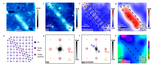图1 (a)单层Fe(Te,Se)薄膜的STM形貌图,图中亮线部分为畴界D1所在区域。(b)畴界处晶格结构的模拟示意图,晶格在畴界处沿Fe原子最近邻方向出现挤压。(c) 图a中畴界区域放大后的STM形貌图,其中畴界所在区域用黑色虚线标记出。(d) c图的傅里叶变换(FFT)结果,图中只能看到表面Te/Se原子晶格对应的布拉格点(QBragg)。(e) c图所示区域的局域态密度空间分布,在畴界区域内局域态密度表现出周期性的调制结构。(f) e图的FFT结果。除了QBragg外,图中还出现了局域态密度周期性调制对应的波矢Q。(g) 局域态密度调制的空间振幅分布,振幅值的大小对应了调制信号的强弱。具有较强调制信号的区域主要集中在虚线所示的畴界范围内。(h) 局域态密度调制的空间相位分布,在虚线所示的畴界区域相位较为均匀。