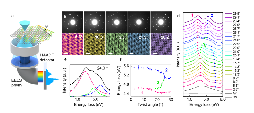 图1.转角h-BN/石墨烯异质结构中带间跃迁的测量。(a)STEM-EELS光路示意图。(b-c)转角分别为5.6°、10.3°、15.5°、21.9°和28.2°的h-BN/石墨烯异质结构的衍射(b)和HAADF图像(c),(c)图中,标尺长度为1 nm。(d) 不同转角的h-BN/石墨烯EELS谱线。(e) 以24°EELS结果为例的分峰方法展示,采用高斯峰形拟合。(f)从(d)中提取出的跃迁能量,其中,误差杆由多次重复测试得到。