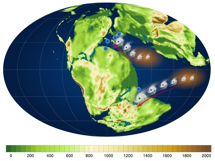 图2.早侏罗纪极热事件期台风潜在生成位置(橘黄色位置)和移动路径示意图。彩色标尺为陆地高程,紫色点是强风暴造成的沉积地质记录的大致位置(制图:燕青、胡永云)。