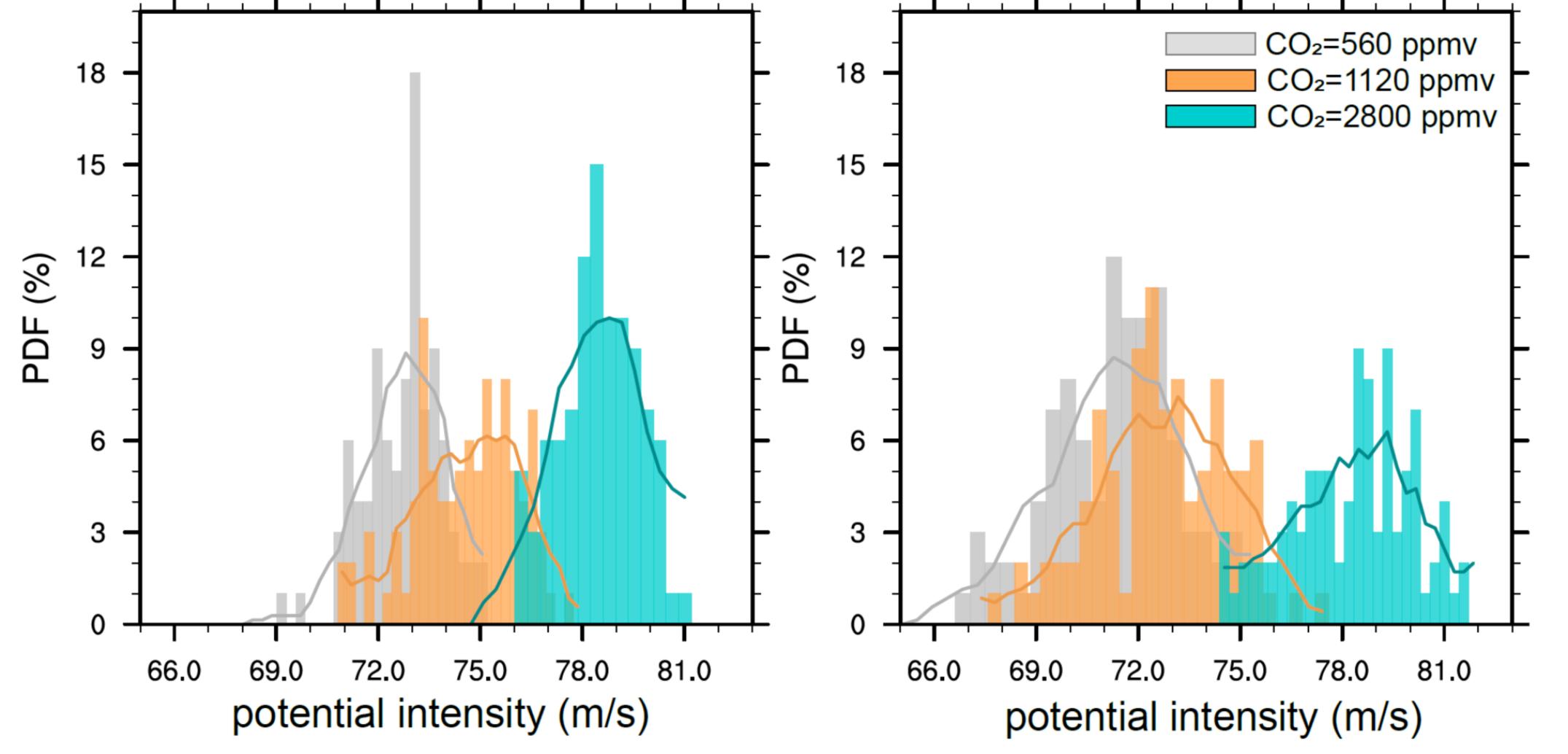 图3.三类不同CO2浓度下台风潜在强度的概率密度分布(右:北特提斯洋;左:南特提斯洋)。这里的台风强度是理论推算的,台风实际风速要弱一些。