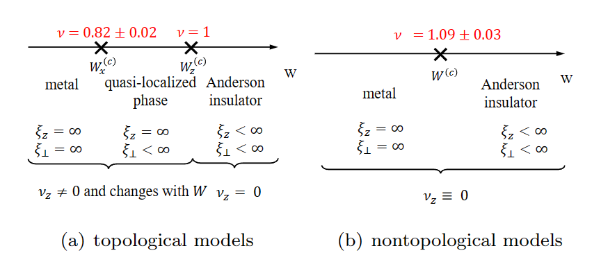 除了准局域相的发现外,论文还首次发现了由拓扑引起的安德森转变的一种新的普适类。相变的分类是物理学的终极目标之一,而安德森相变无论是在理论上还是实验上都是最重要的相变之一尽管过去几十年来,在固态、原子、分子和光学系统中对无序拓扑系统中的输运现象进行了深入研究,但能带拓扑在安德森转变中的作用仍然不为人所知。尽管已经进行了深入而广泛的研究,但在相同的对称类和空间维度下,由拓扑引起的不同安德森相变的临界指数尚未被报道。在这篇论文中,肖振宇等人首次阐明了由拓扑引起的安德森转变的新普适类。