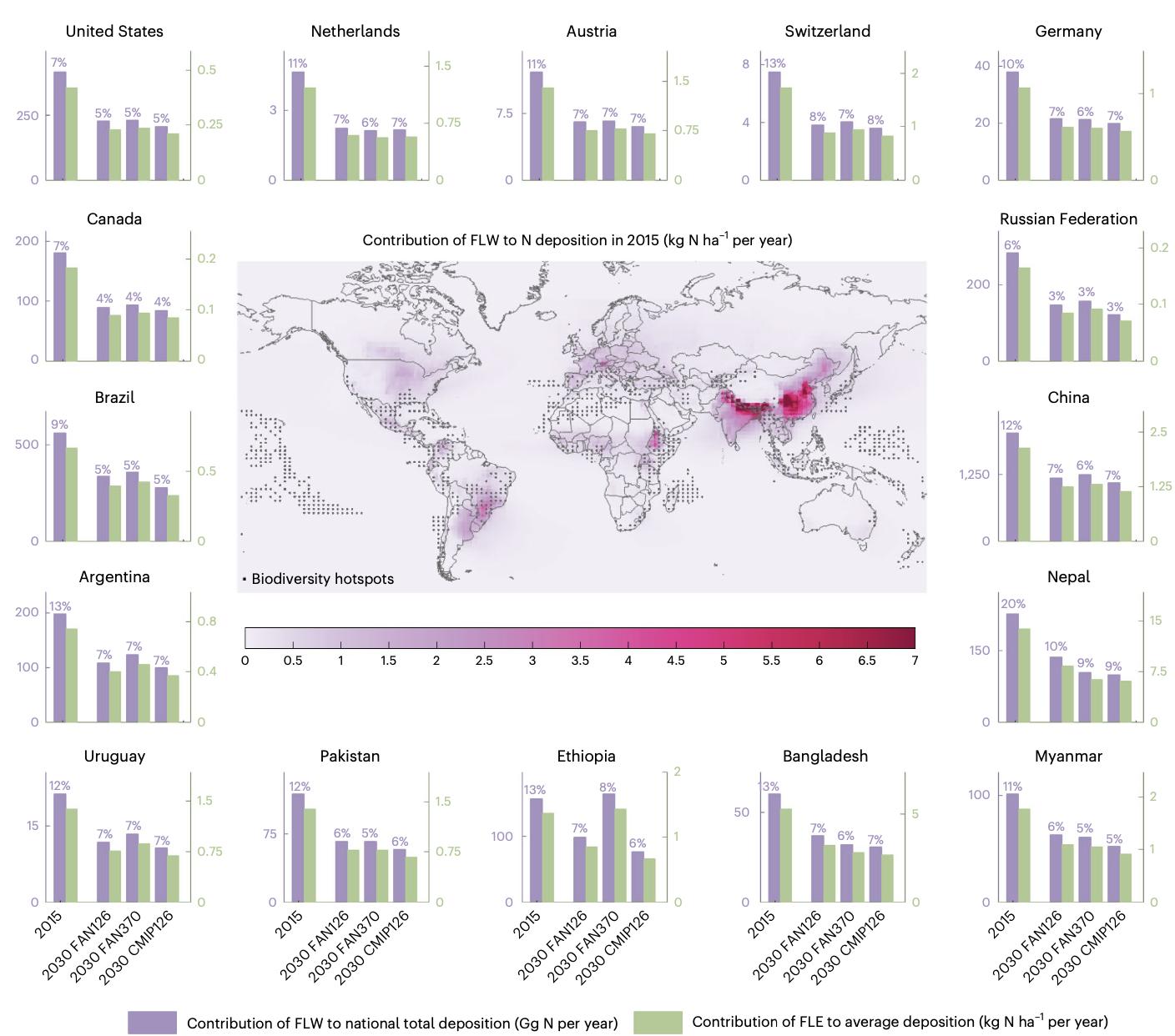 此外,避免FLW可使全球氮沉降减少9.7百万吨氮/年,减幅为7%,最大幅度的氮沉降减缓发生在中国东部、印度东北部和欧洲部分地区。同时,全球生物多样性热点区域的氮沉降超标率将减少19%,这些热点区域虽然仅占地球表面积2.5%,却提供全球35%的生态系统服务。这些地区对于过量氮沉降(>5千克氮/公顷/年)非常敏感,氮沉降减缓将对当地和全球生物多样性有显著的保护作用,例如,喜马拉雅地区和大西洋森林保护区的氮沉降通量下降高达8千克氮/公顷/年和1.3千克氮/公顷/年。在2030年,实现FLW减半将使全球氮沉降降低4.7-6百万吨氮/年。研究团队进一步指出,全球农业生产技术改进带来的农业氨减排潜力(41%)大于FLW治理带来的农业氨减排潜力(21%),虽然后者不能替代前者,但能有效促进活性氮污染治理。